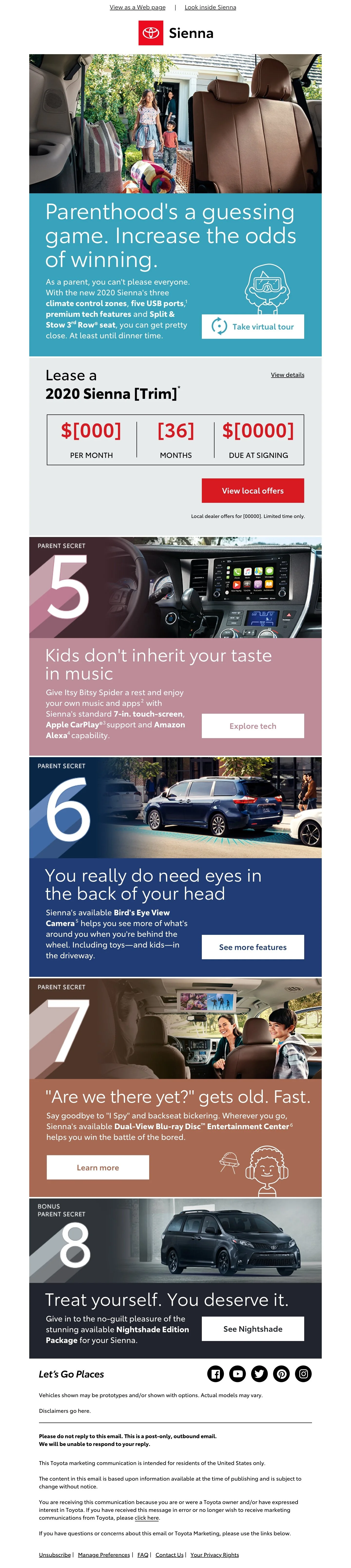 Email campaign for the all-new Sienna & features. SIENNA ACCOMMODATEs FOR ANYthing CHILDren throw at parents.